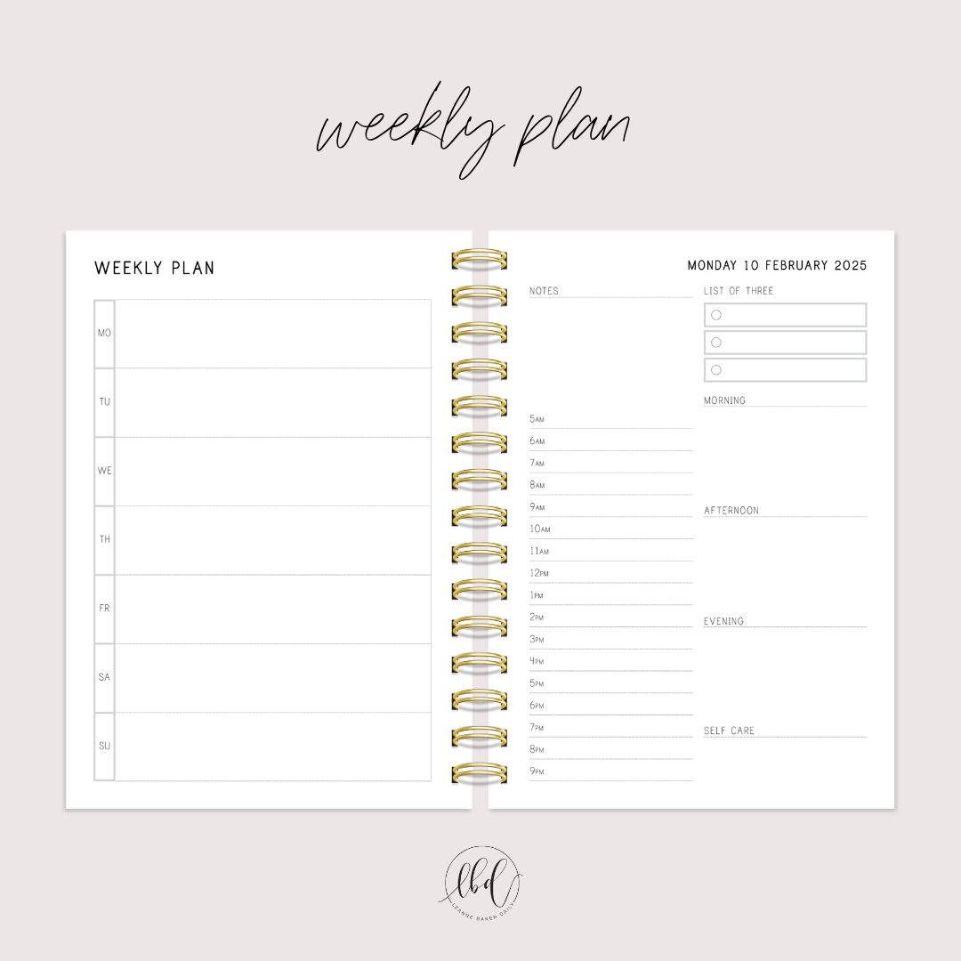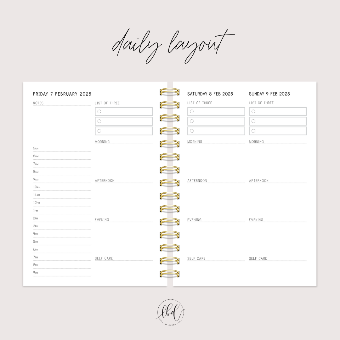 - Day to a page (Monday to Friday) – with space each day for your List of 3; time slots for planning out the day in more detail from 5am to 9pm; also Morning/Afternoon/Evening and Self Care spaces