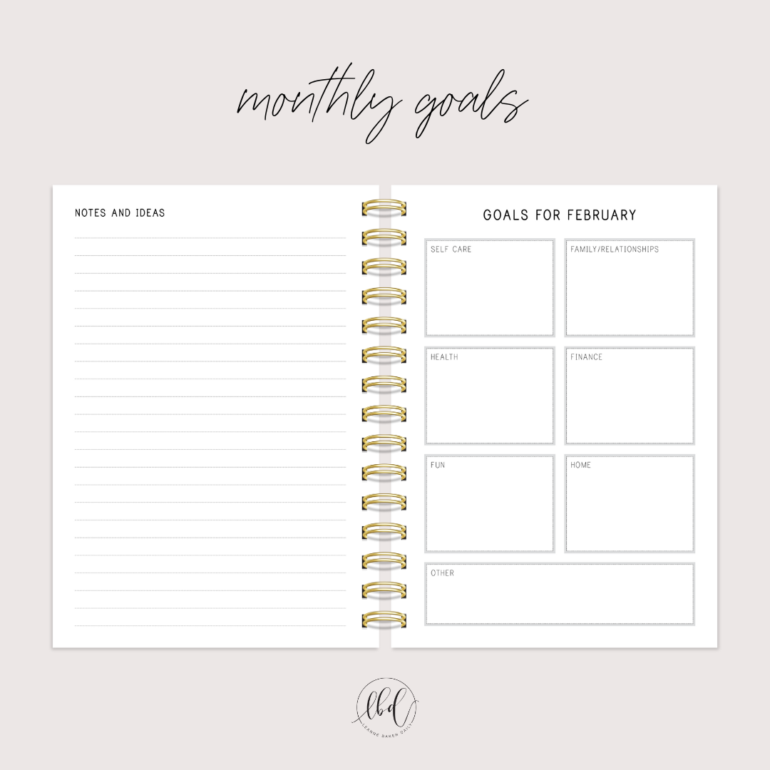 - Monthly Goals page at the start of each month for 12 months (with headings – Self Care, Family/Relationships, Health, Finance, Fun, Home, Other)