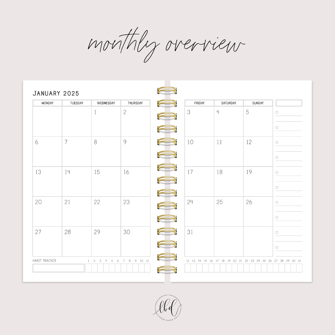 - Monthly Overview spread and a full month habit tracker across the bottom of the spread